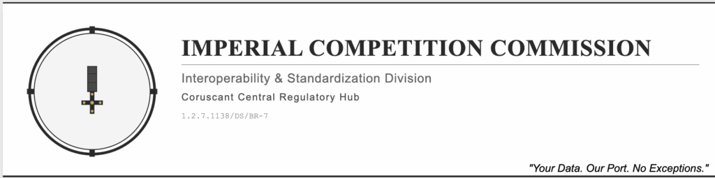 The Imperial Competition Commission, Interoperability & Standardization Division, has reviewed your proposal to develop a “walled garden” digital ecosystem utilizing exclusive K-T Link™ physical connectors and encrypted HoloNet protocols. As you are no doubt aware, Section 501(c)(3.14) of the Galactic Interoperability Mandate (as amended post-Death Star) prohibits any effort to subvert or undermine the Galactic Standard Scomp Link (colloquially, “Phillips head”), as codified in the historic R2 Decree.